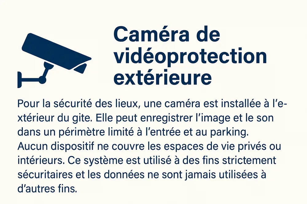 Pour la sécurité des lieux extérieurs et la prévention des comportements non conformes au règlement, l'accès principal au gîte (entrée, parking) est placé sous vidéosurveillance extérieure.